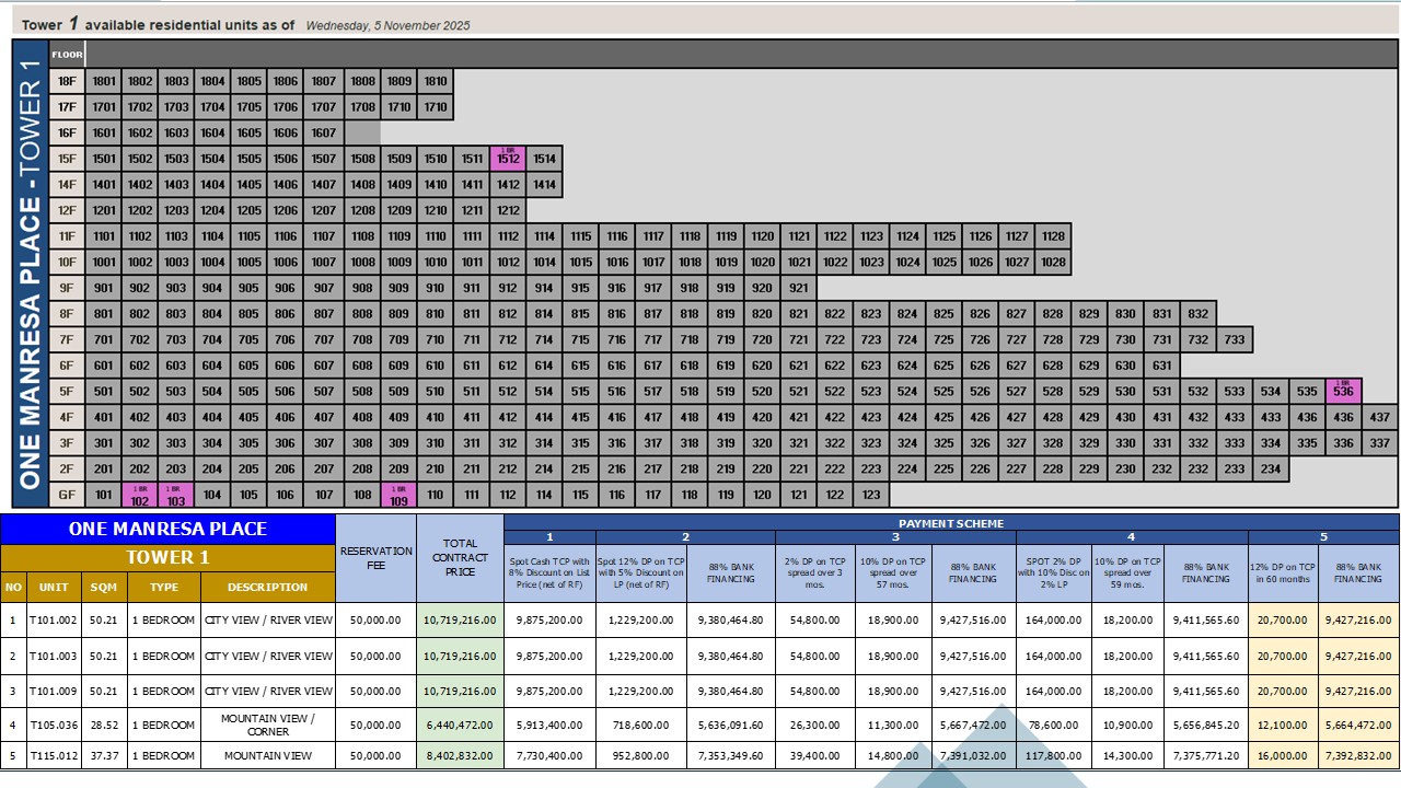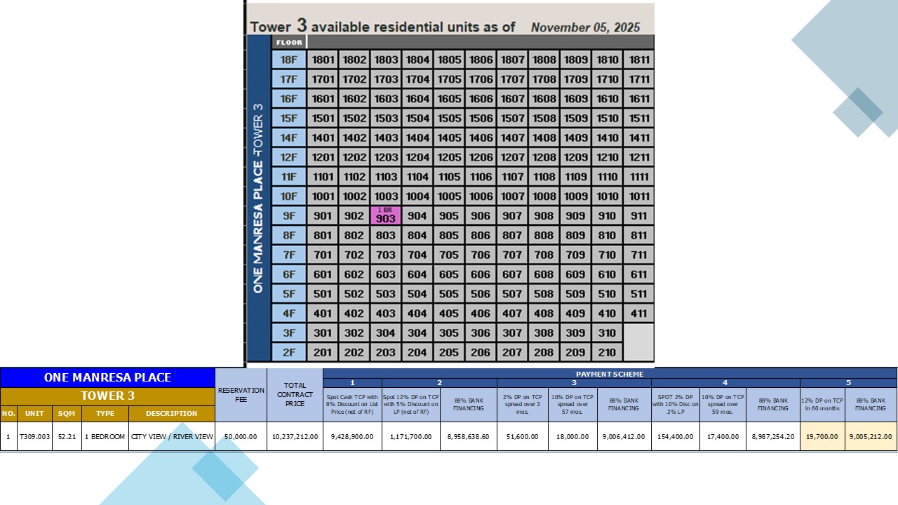 ONE MANRESA PLACE is the residential component of Manresa Town consists of three residential towers with a shared retail podium. The towers will have 19, 26, and 19 floors respectively, with a total of 940 residential units.