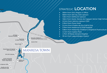 Being located within Manresa Town in Uptown Cagayan de Oro is a major plus. Uptown CDO is a rapidly developing area with increasing access to commercial centers like SM City CDO Uptown. This means convenient access to shopping, dining, entertainment, and other essential services.